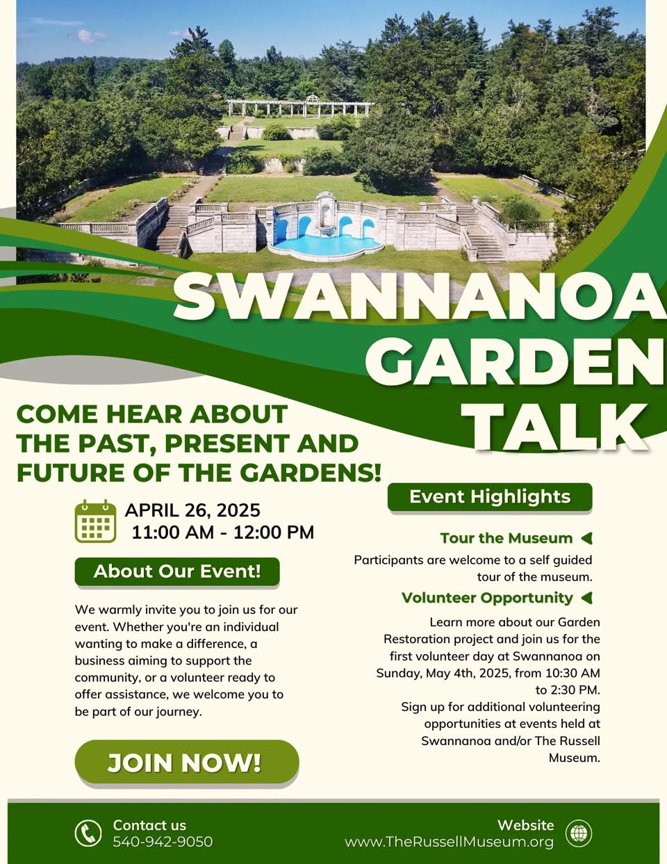 Volunteer Opportunity: Learn more about our Garden Restoration project and join us for the first volunteer day at Swannanoa on Sunday, May 4th, 2025, from 10:30 AM to 2:30 PM. Sign up for additional volunteering opportunities at events held at Swannanoa and/or The Russell Museum